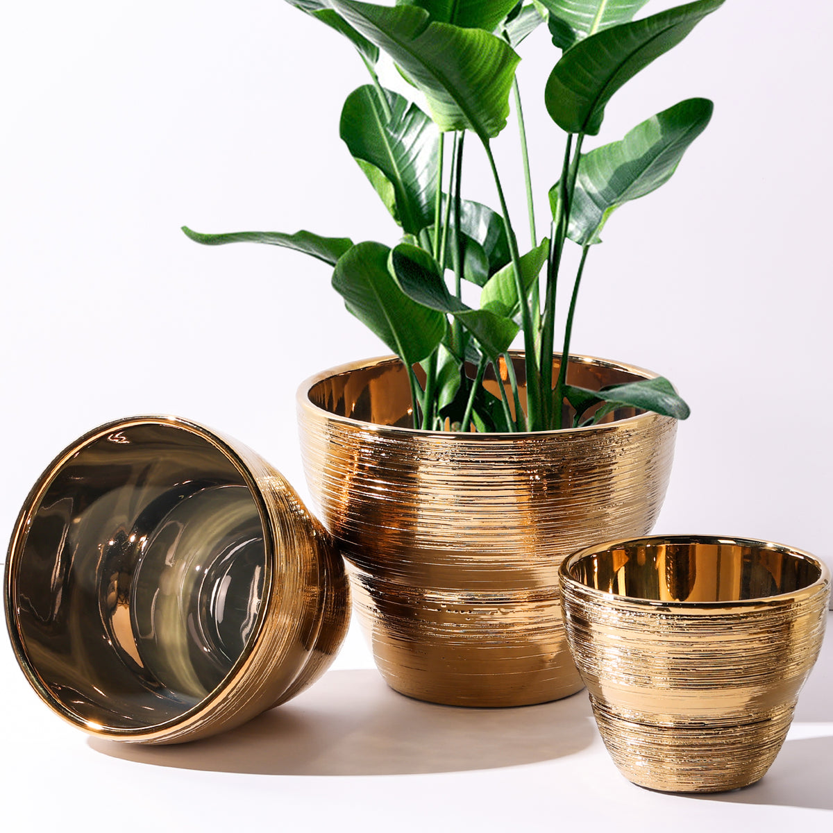 Jofamy Ceramic Plant Pots 7 1 5 9 4 7 Inch Brushed Gold Finish Planter Pots With Drainage Silicone Plugs Mesh Pads Flower Pots For Indoor Plants Ideal For Birthday Wedding
